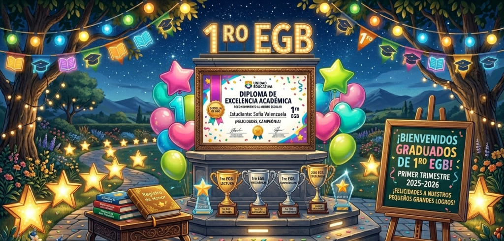 Un estudiante de 1° EGB “A” y uno de 1° EGB “B” fueron reconocidos por obtener las mejores calificaciones en sus respectivos paralelos. A pesar de encontrarse en el inicio de su etapa escolar, demostraron responsabilidad, dedicación y una actitud positiva frente al aprendizaje.