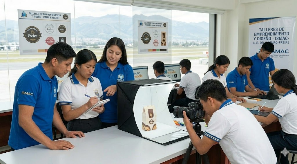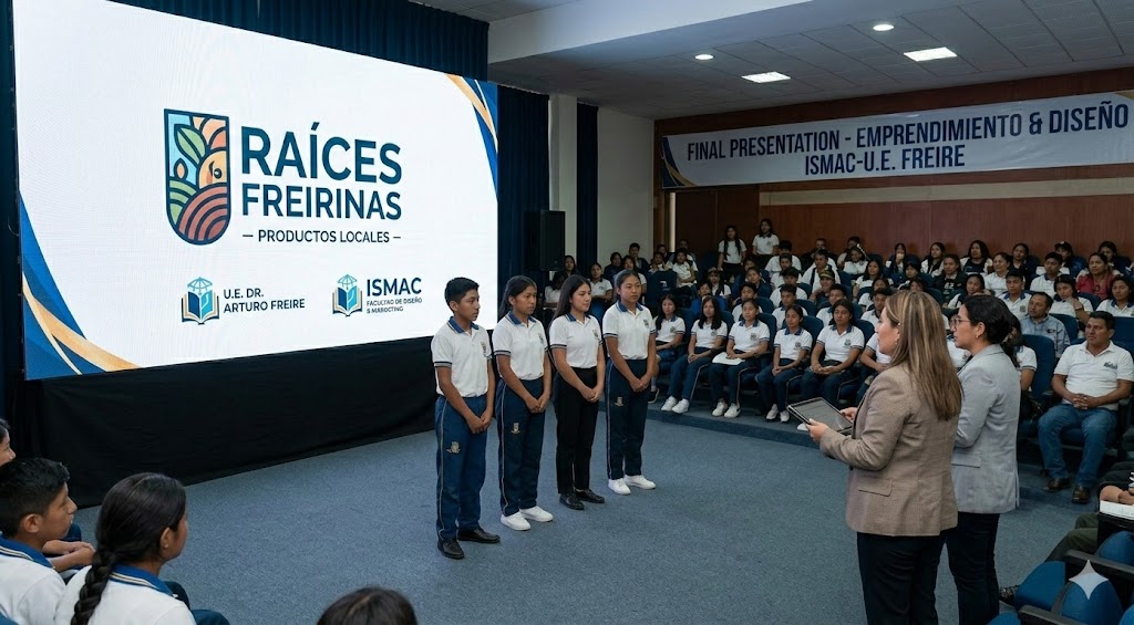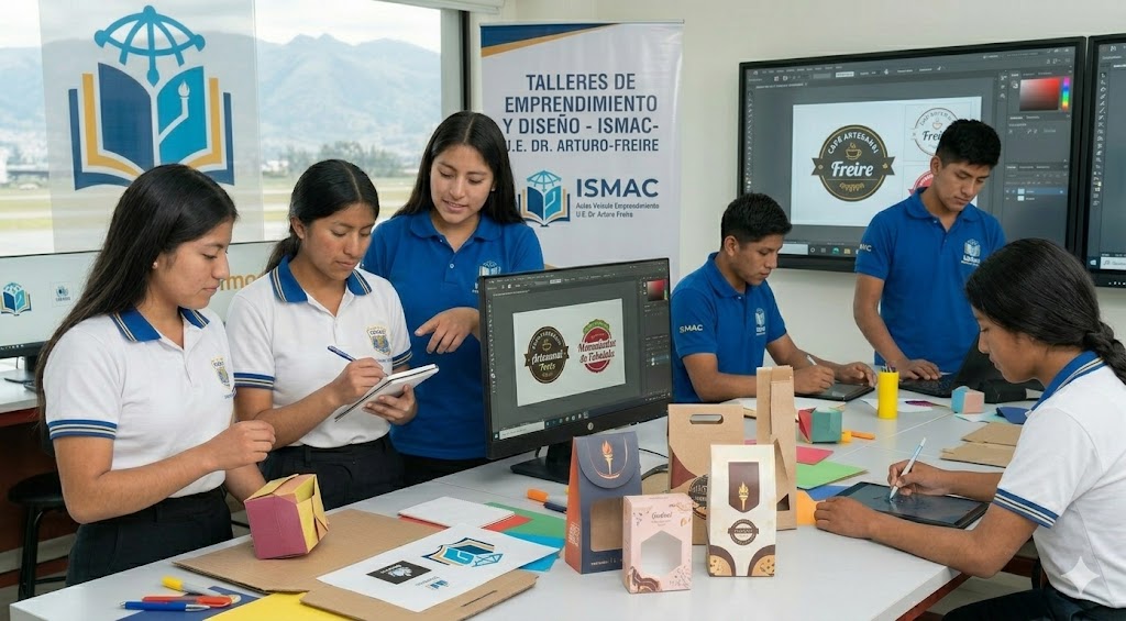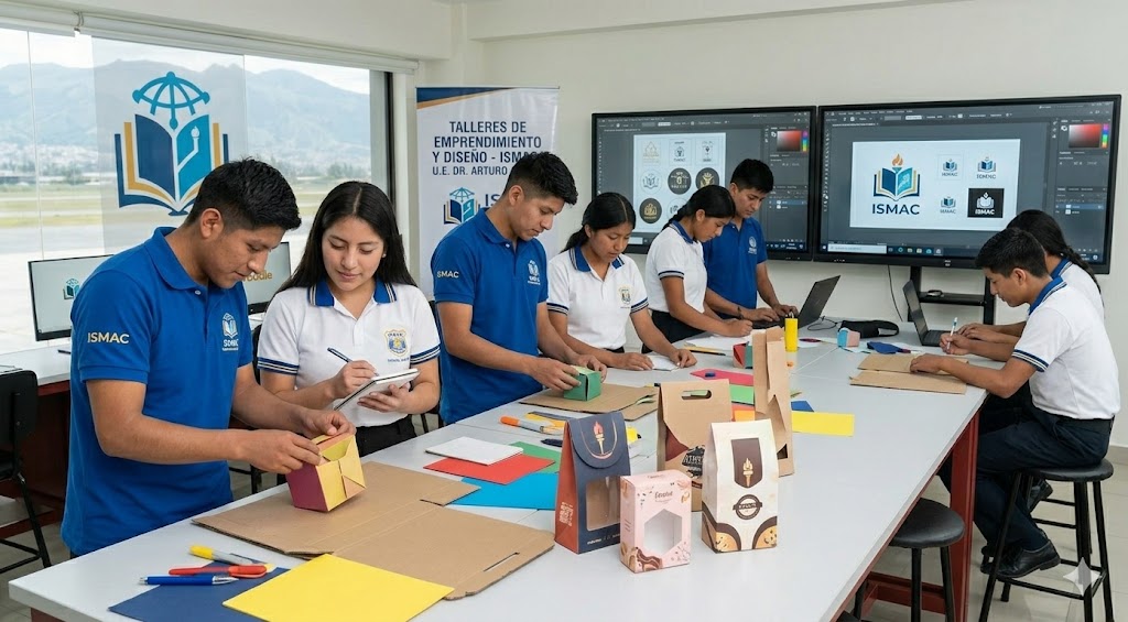 Aquí representamos la unión entre las facultades de Diseño y Marketing del ISMAC con los proyectos escolares. El instituto ayuda a los alumnos del colegio a darle una imagen profesional a sus ideas de negocio o ferias escolares.